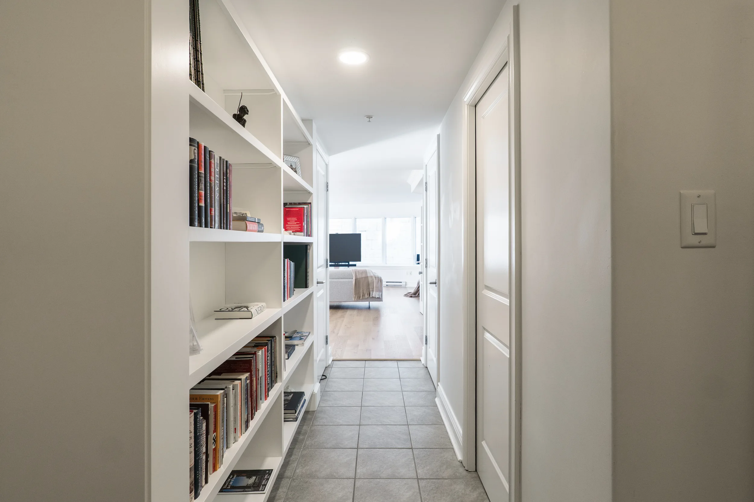 The brief yet fulfilling project involved the renovation of a bedroom accent wall and hallway bookcase of a condo in the heart of downtown in Halifax, Nova Scotia. LED strips help to illuminate the clients' prized belongings as the walnut paneling and integrated storage complemented their bedroom's mid-century modern inspired furnishings.